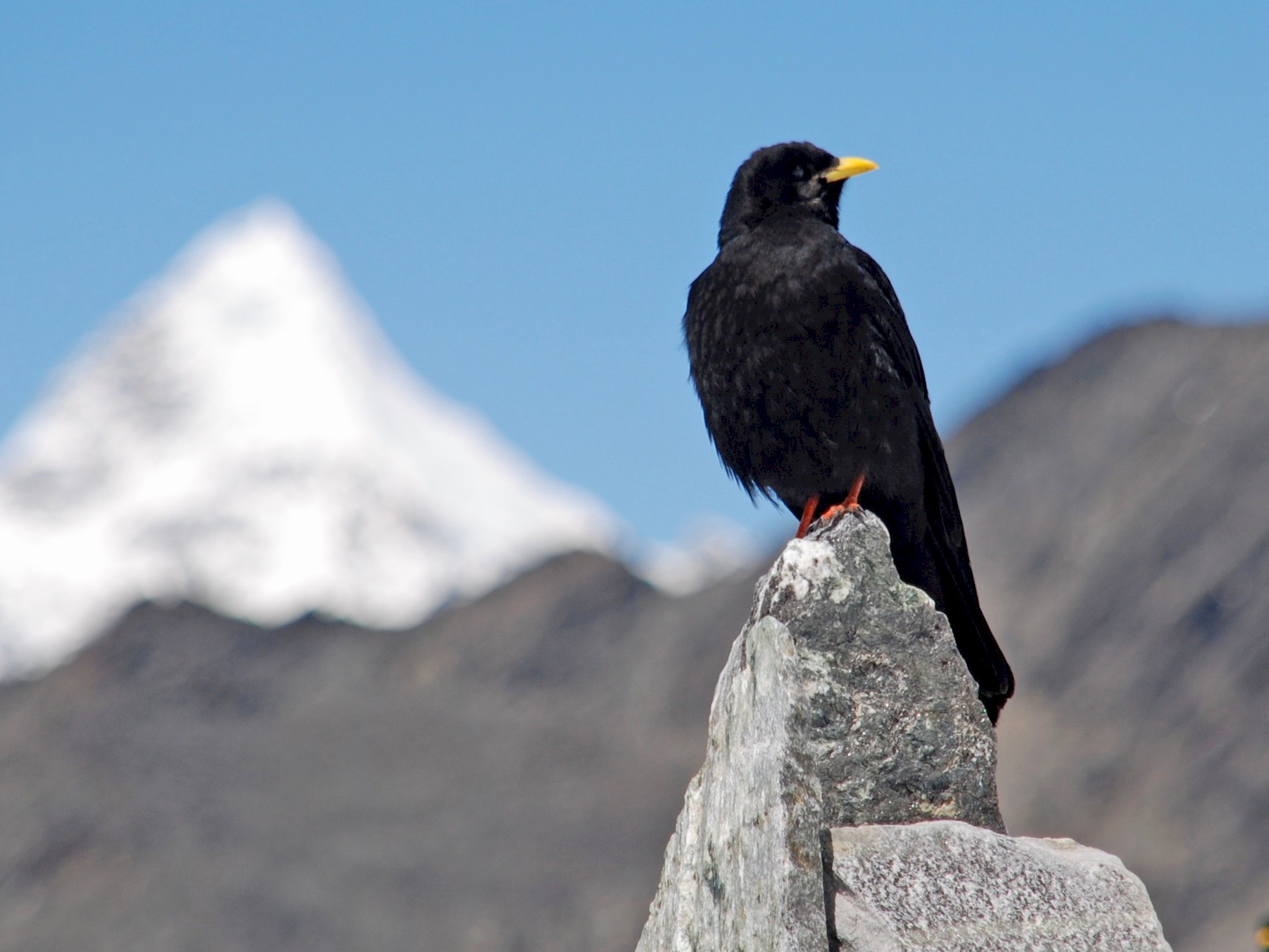 Este córvido es inconfundible por su pico amarillo. En Europa cría a altitudes de entre 1.260 y 2.880 metros, aunque en el Himalaya tiene el récord absoluto de ave que nidifica a mayor altitud: 6.500 metros. En la Península Ibérica se encuentra únicamente en Pirineos y Cordillera Cantábrica, donde se alimenta en general de todo, haciendo honor a la tradicional omnivoría de los córvidos. Durante el invierno se aproxima a zonas humanizadas para encontrar alimento en los desechos humanos. Son bien conocidas por los esquiadores al merodear en las estaciones de esquí para encontrar alimento en esta época del año. En España se encuentra su subespecie nominal.